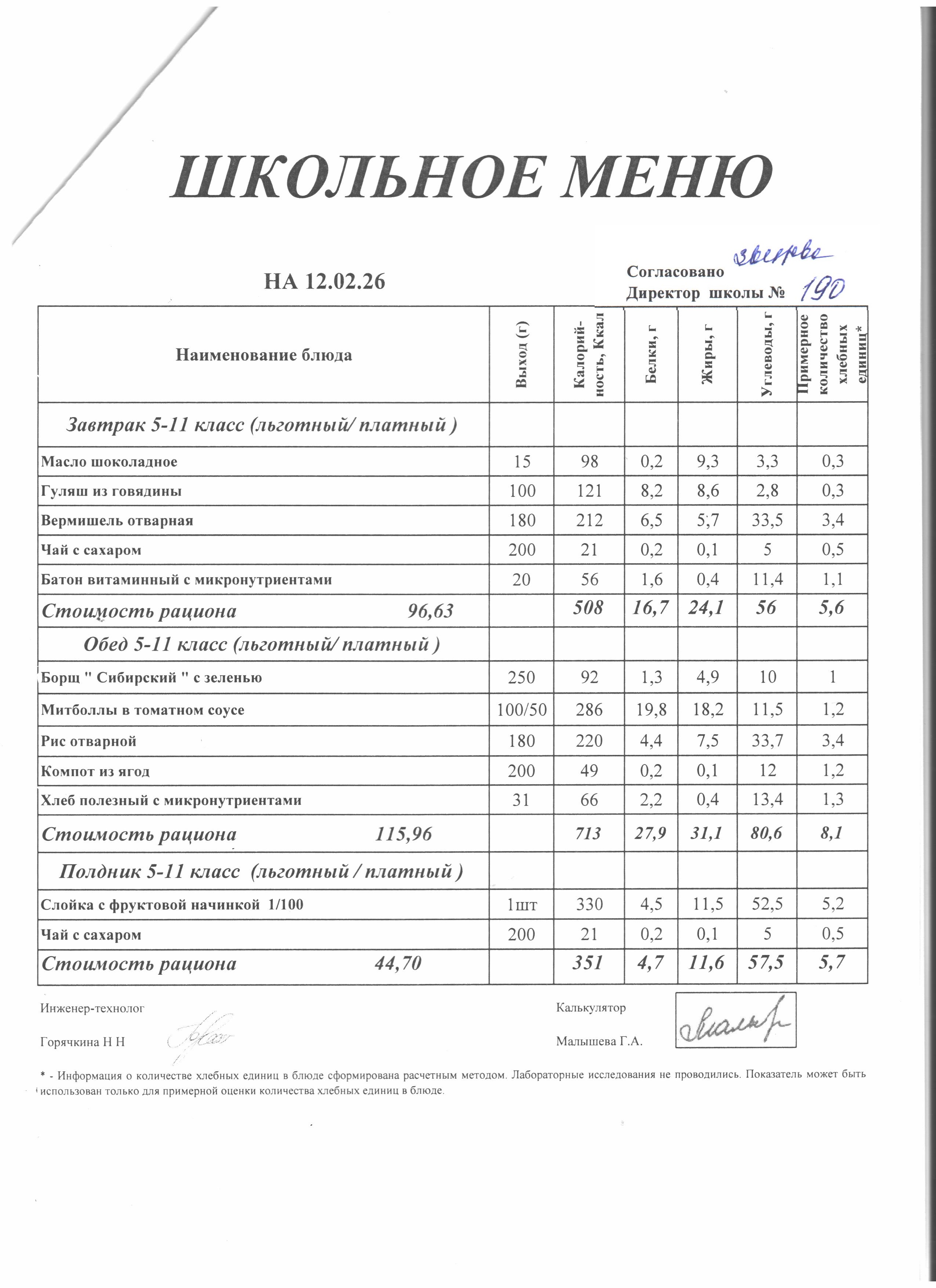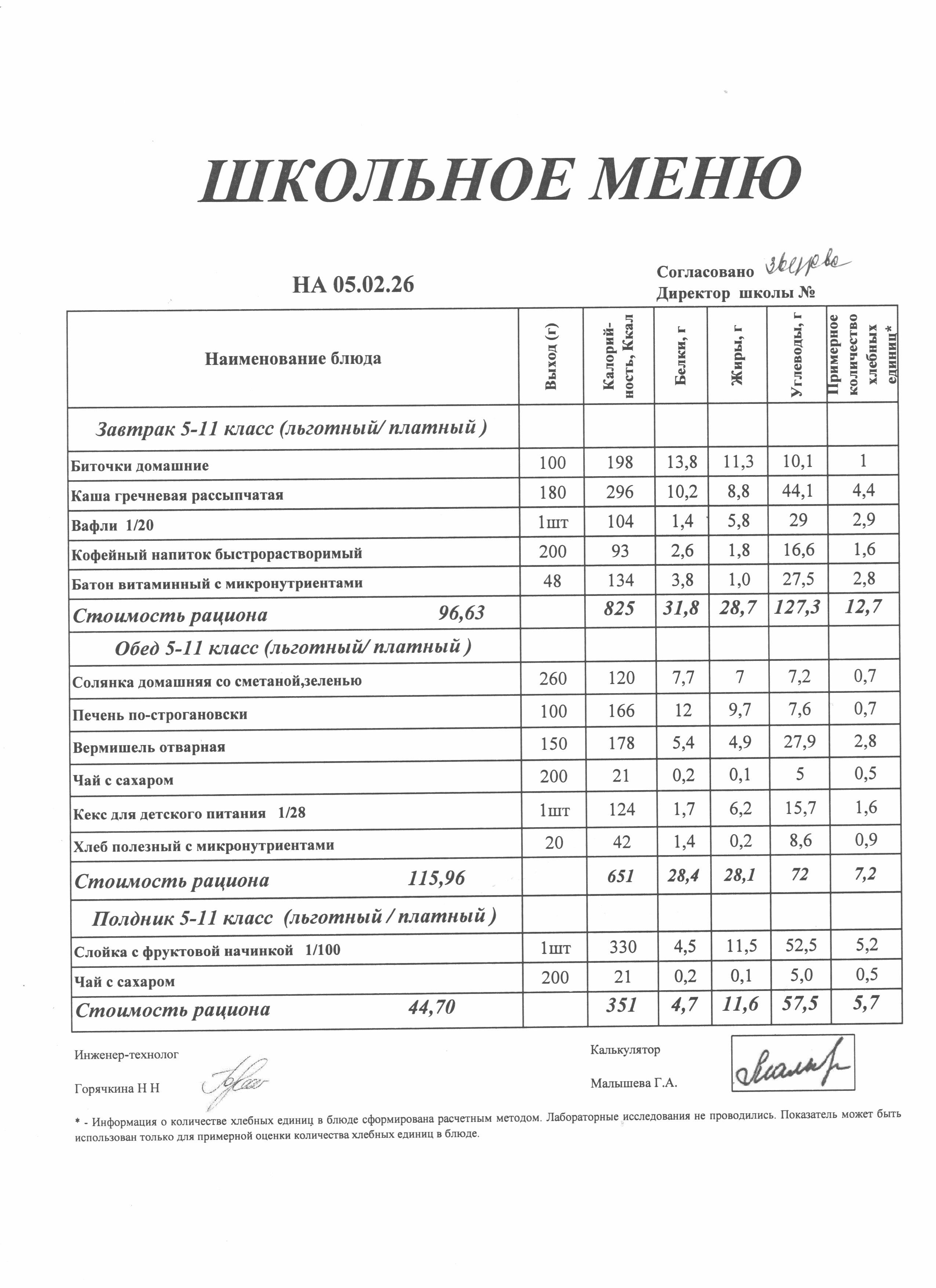 МЕНЮ ежедневного горячего питания